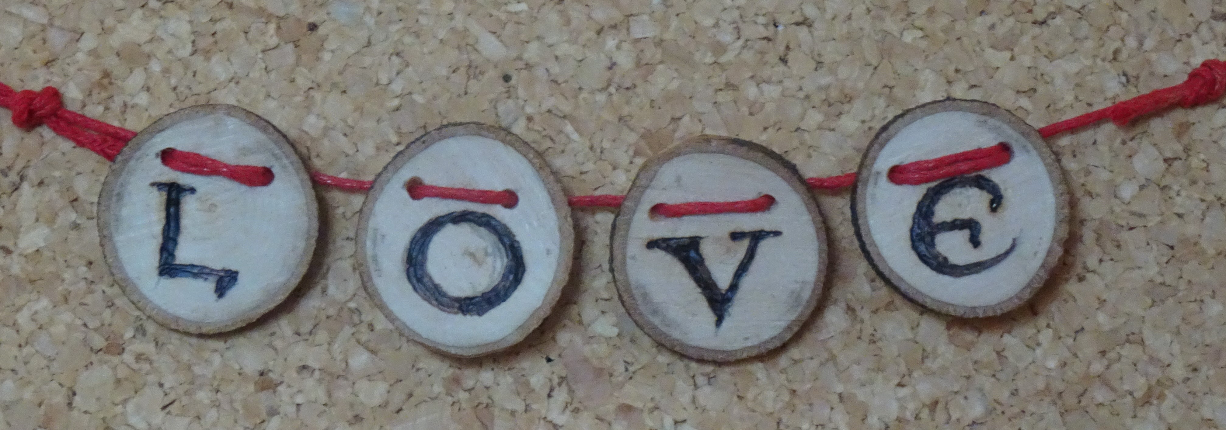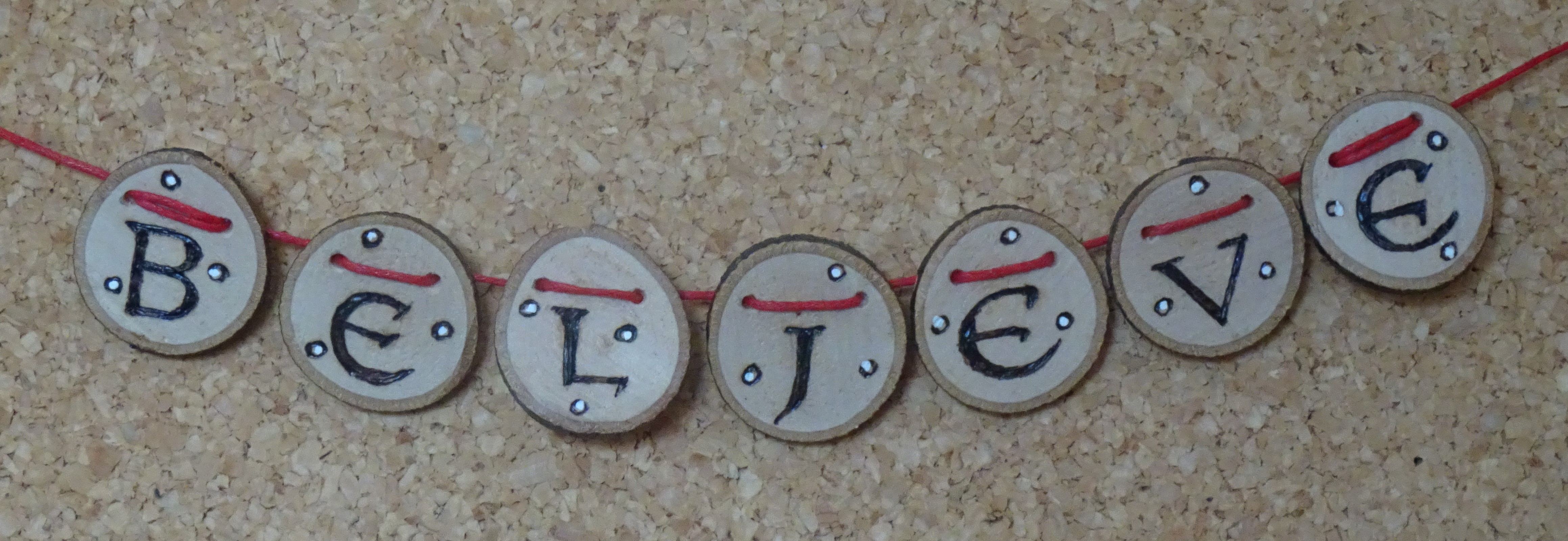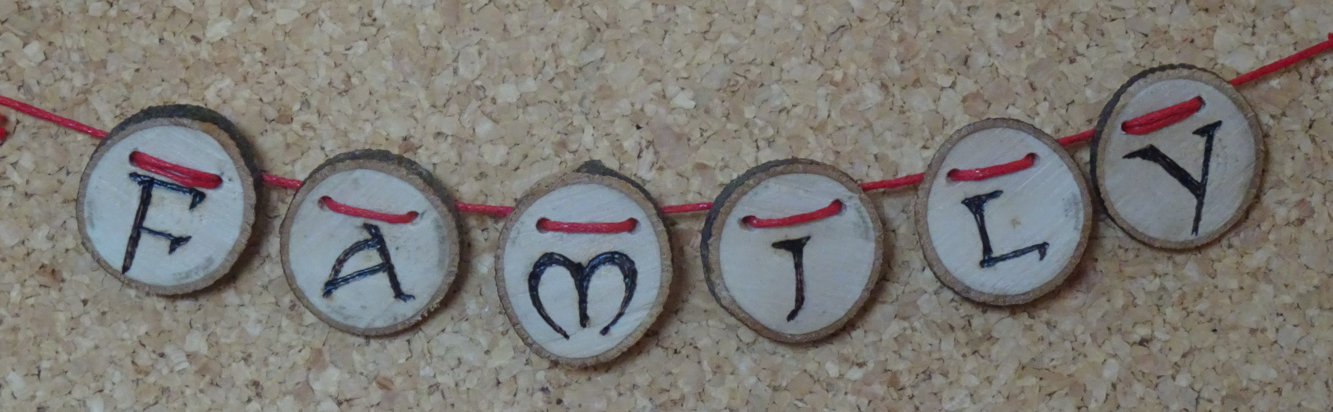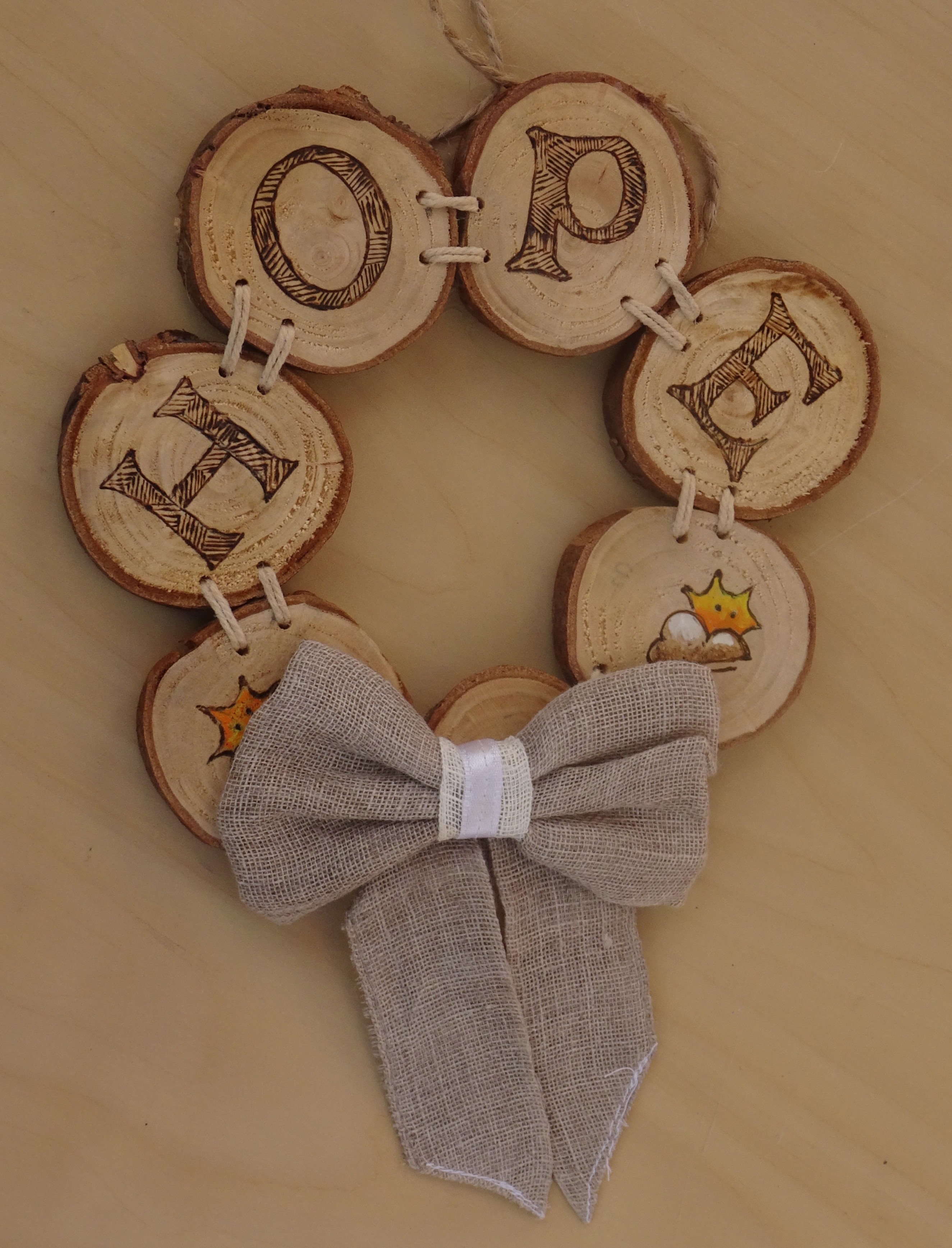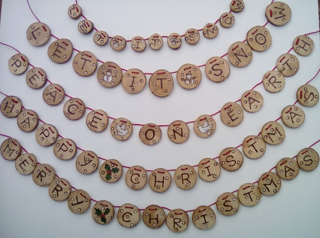These Christmas phrases below are also unique bunting creations handcrafted from natural wood discs using pyrography techniques. They have small, cute images such as Snowmen, Doves, and Holly to separate the words.
