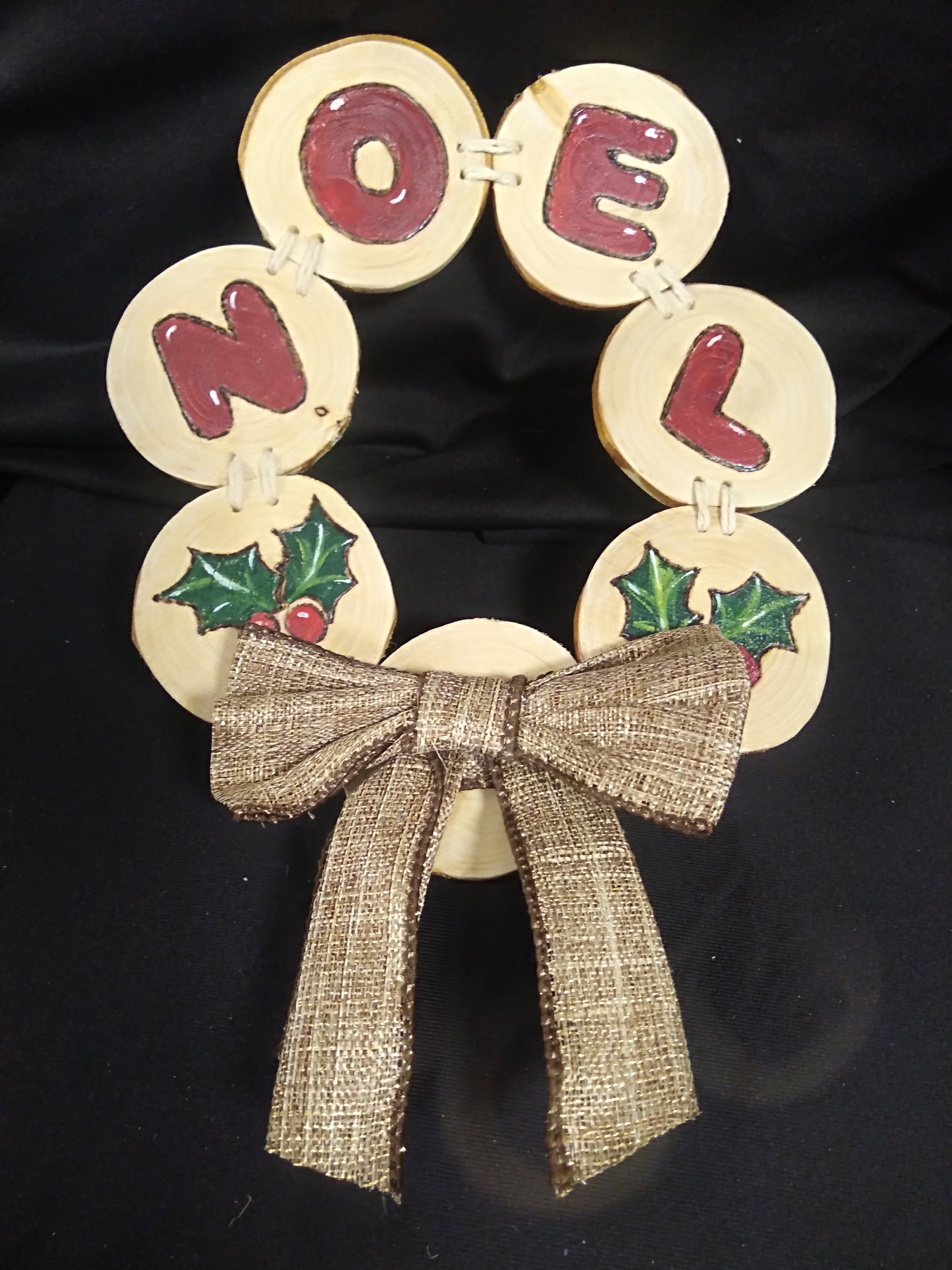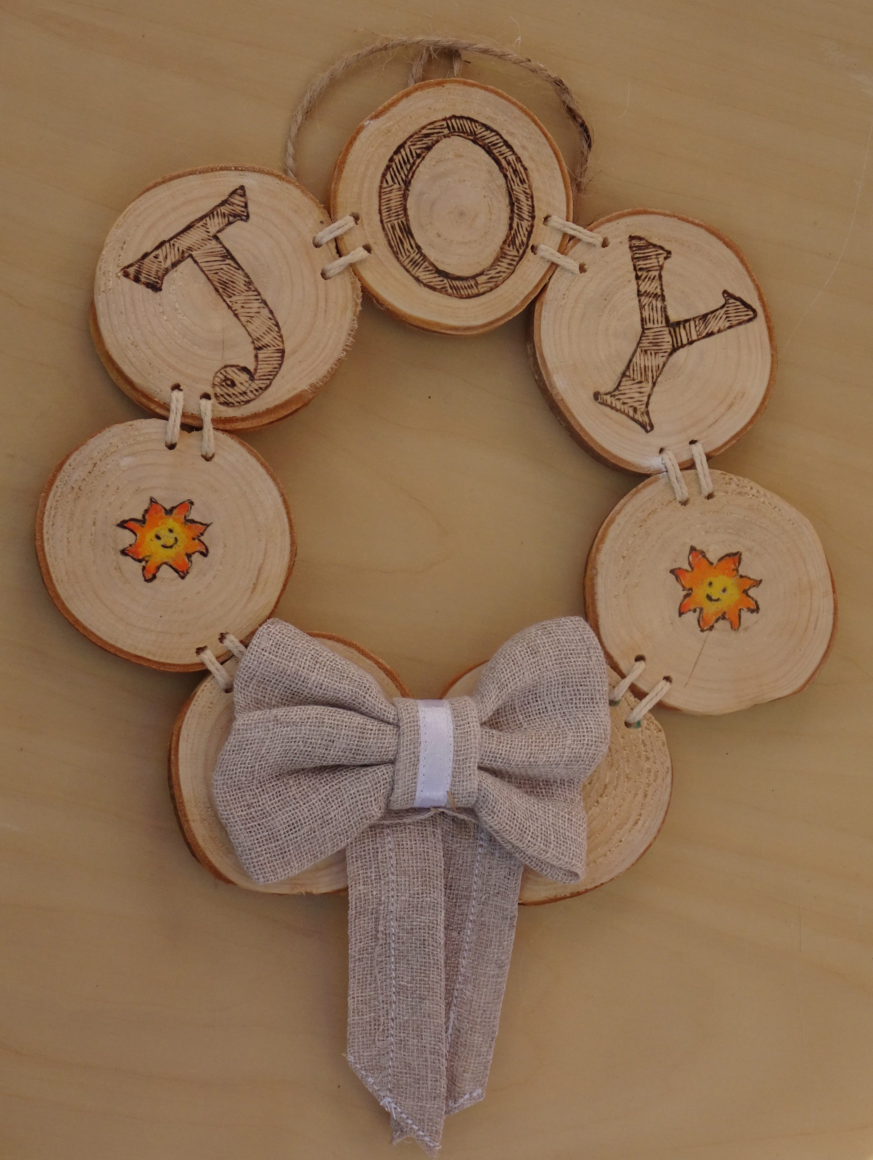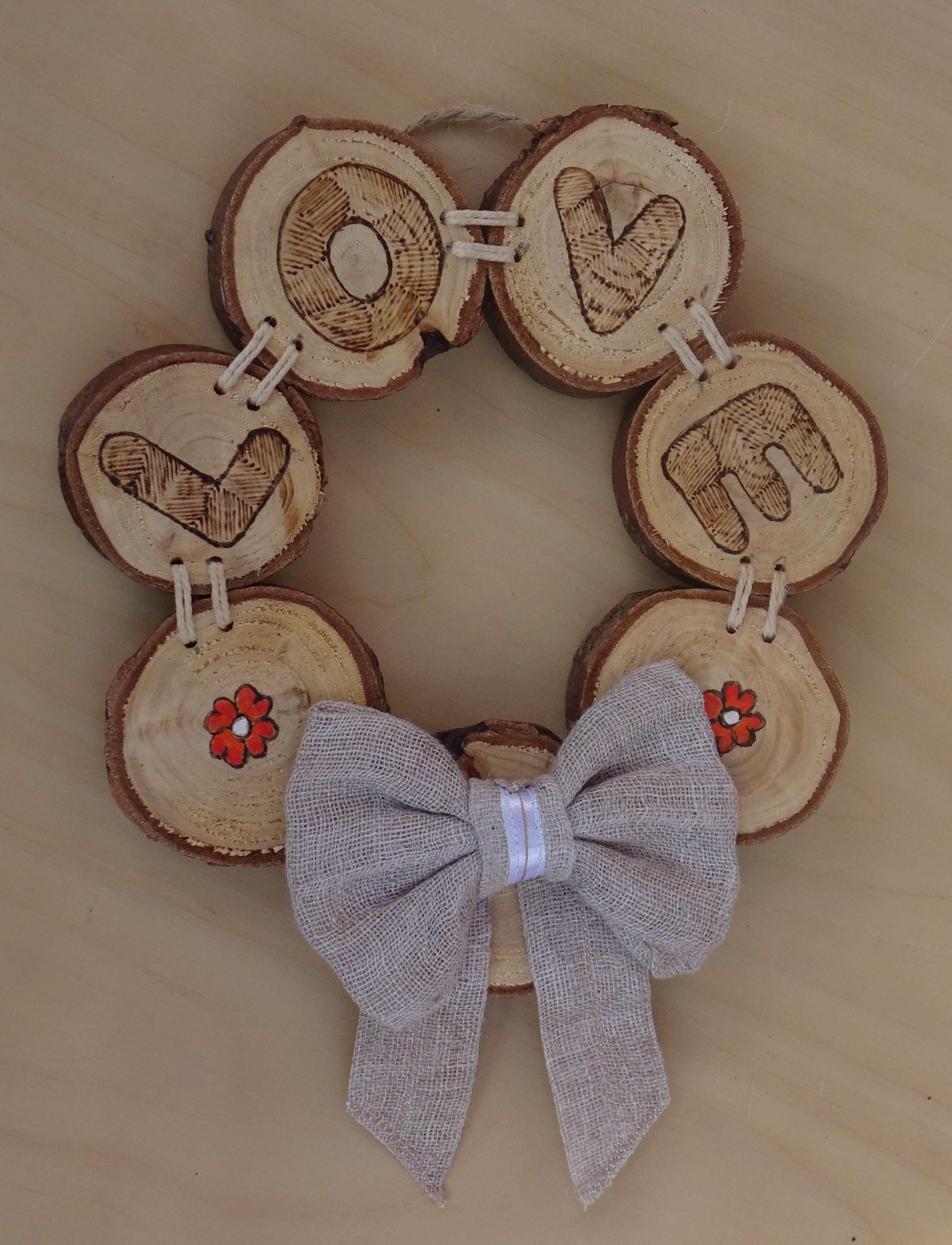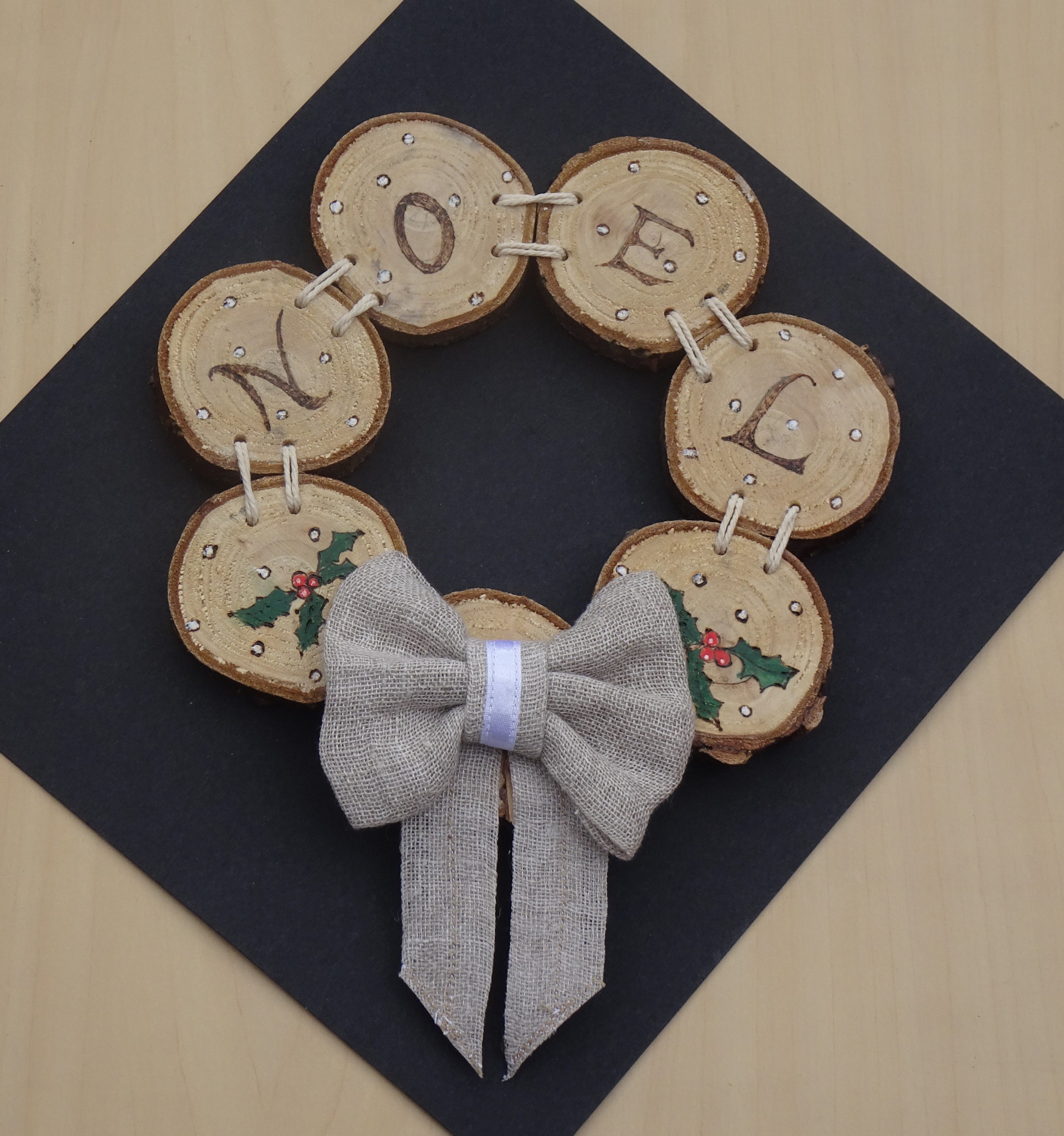 These wooden wreaths are ‘sewn’ together with string. We are experimenting with the design and lettering. Small wreaths are approximately 15cm wide, priced at £11.80, Large wreaths are approximately 18cm wide, priced at £13.80