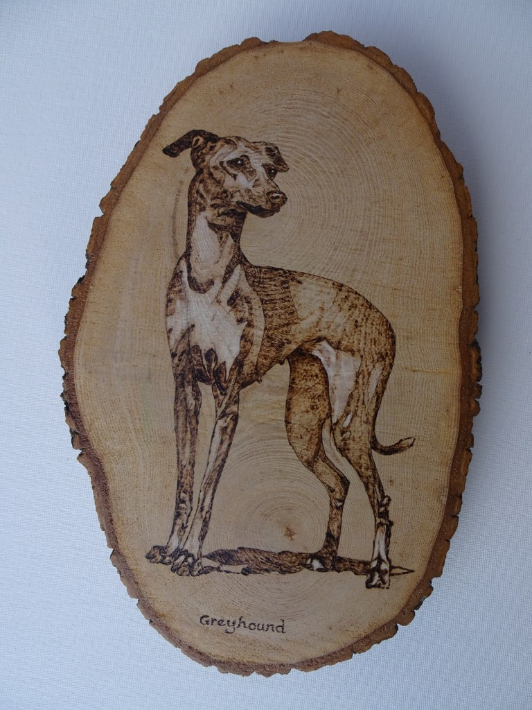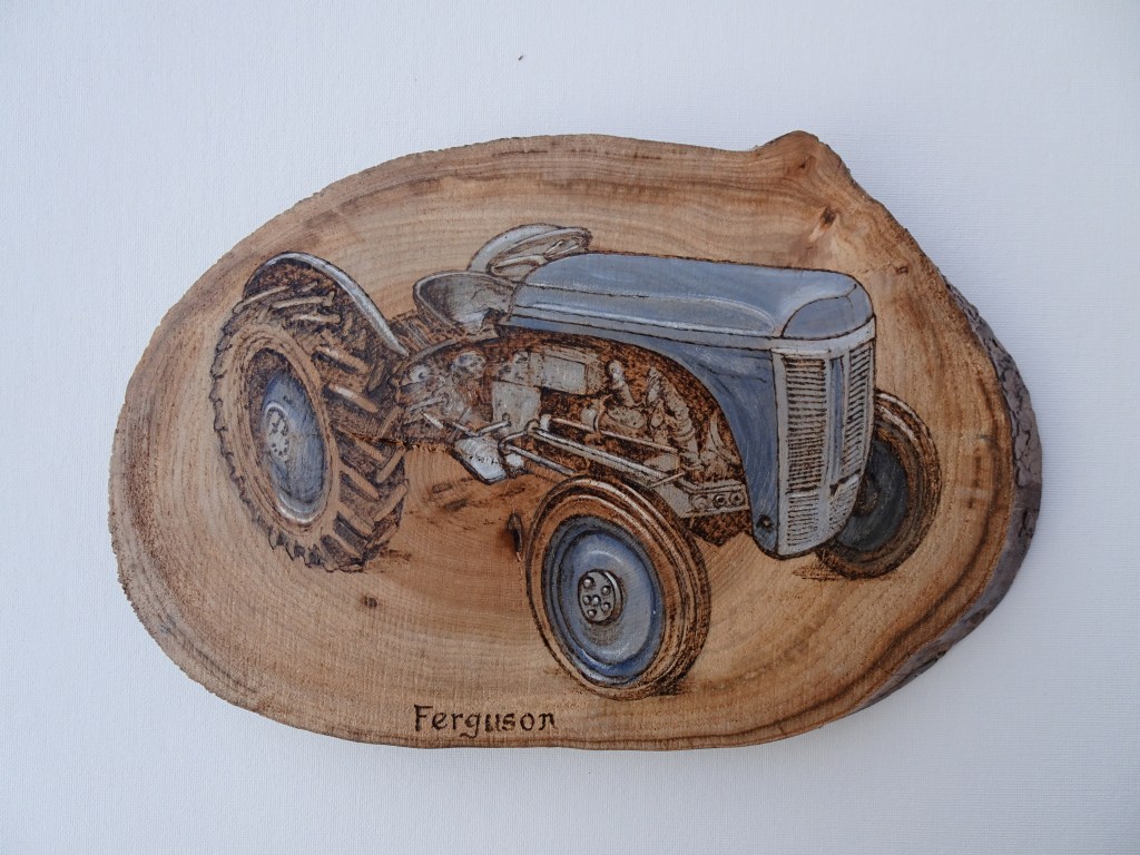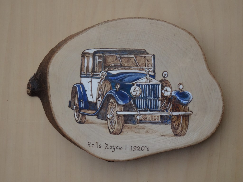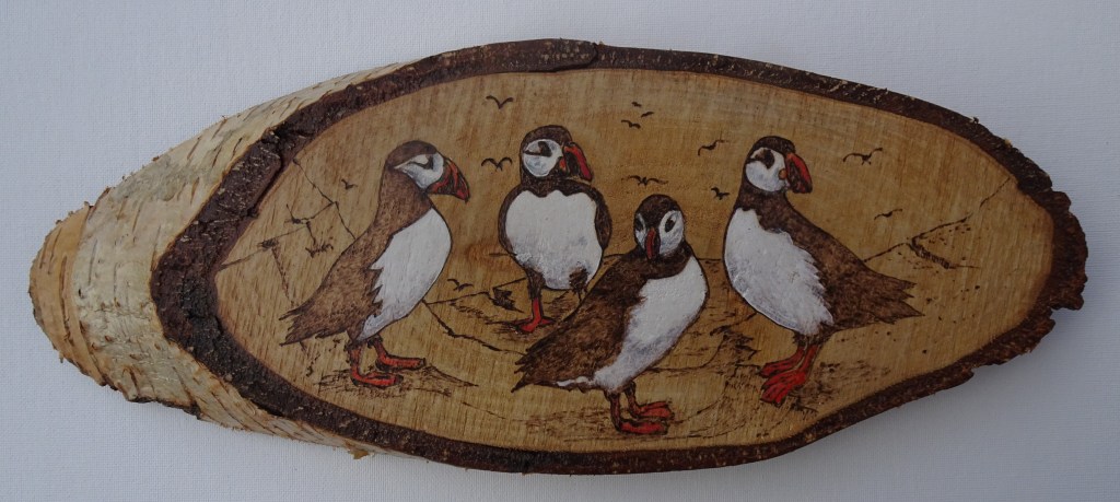 Burned then painted onto silver birch the approximate size here is 28 x 13cm and the cost – £30.